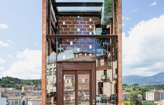 Carles Enrich工作室在西班牙加泰罗尼亚悬崖边修建了一个高20米的电梯。项目采用砖砌结构,连接了新老城镇。墙面为镂空砖,电梯所在的Gi