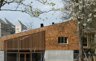 项目毗邻Sondermarken公园,哥本哈根社区中心设有山形墙和加拿大雪松遮阳板。项目由Sophus Sobye建筑事务所设计,该项目旨在为当