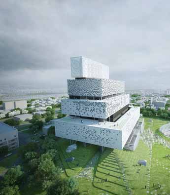 荷兰MVRDV建筑事务所设计了一座位于巴黎的办公楼。建筑特点是中央有一个巨孔。MVRDV将项目成为“挤压平板”(PUSHED SLAB),通过挤