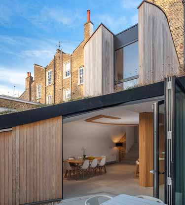 英国Scott建筑事务所为一座位于伦敦Hackney的排屋添加了弯曲的木质增建建筑。建筑绿化屋面中央下方设有一面曲面墙。De Beauvoir住