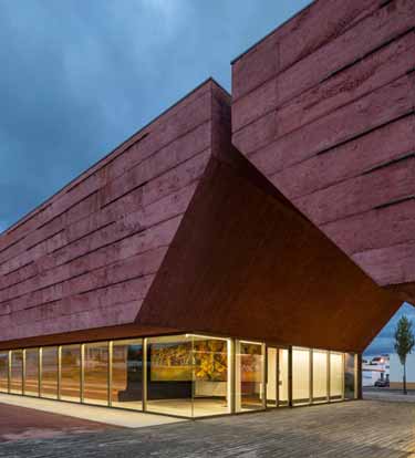 里斯本建筑师Goncalo Byrne设计了一座红色混凝土立面的葡萄牙游客中心,以纪念14世纪的葡西战争。项目是一个展示空间,纪念葡萄牙8年内战