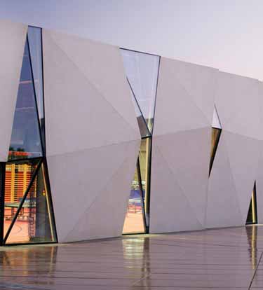 块面混凝土从体育场一侧伸出,西侧和南侧外立面具有凹凸不平的外墙,材料包含覆盖于石材基底之上的浇筑混凝土板。建筑师Idis Turato设计了这座