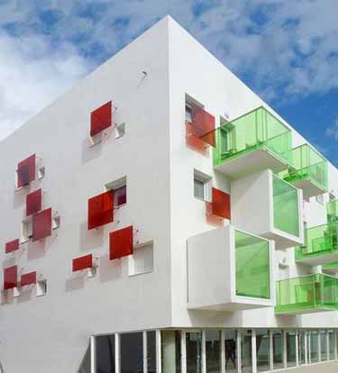 Alergia住宅项目位于法国Bayonne郊区。场地一侧是集体住宅,另一侧是农田。整个项目下方的地下层设有停车场,共有45个停车位。一层设有三