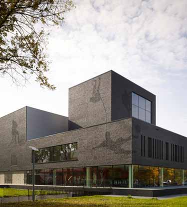 Fontys体育学院位于荷兰埃因霍温,其黑灰色外墙上的穿孔组成了运动员的图形。Mecanoo建筑事务所完成了位于Genneper公园内的建筑项目