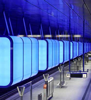 德国汉堡哈芬新城地铁站由慕尼黑Raupach建筑公司设计,最近Pfarre照明设计公司的装饰设计令地铁站面貌焕然一新。地下车站项目是外部材料、纹