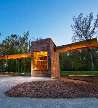 美国印第安纳波里一个乡村公园内,横亘的一棵30米的杨树上悬吊了秋千设施,下方是售货亭。