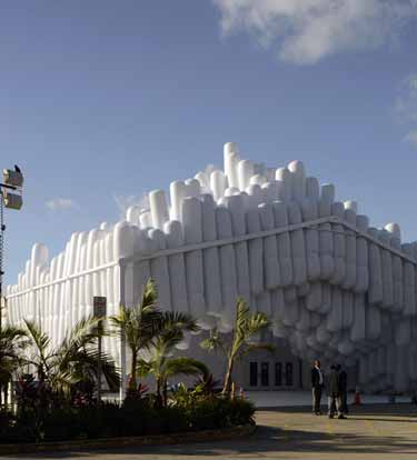 纽约Snarkitecture工作室将迈阿密设计展隐藏在一块充气“法兰克福香肠”立面内部。