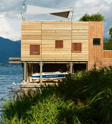 维也纳MHM建筑公司设计了位于奥地利SeebodenMillstaetter湖畔、位于水边陡坡底部一栋船屋。建筑沿水岸伸展,采用了两种材料,显示