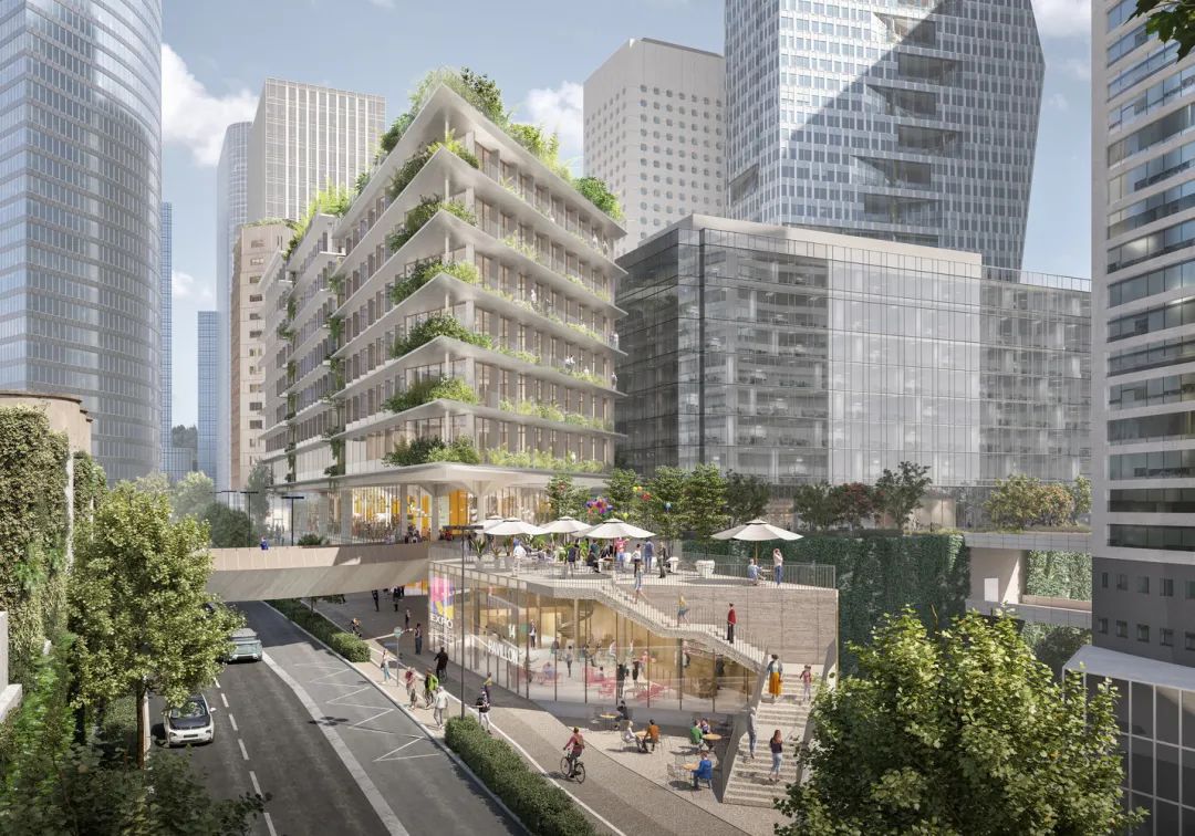 项目是巴黎商业区计划的一部分,该计划旨在成为世界上第一个后碳商业区。设计旨在振兴目前被道路基础设施所掩盖的城市商业区,并引入混合用途开发和新的公