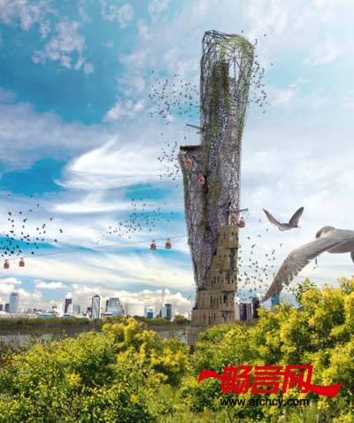 Hila Davidpu, Tal Gazit, Eli Gotman, 和Hofi Harari分享了他们丝垂直动物园竞标项目的“生态悬崖”方