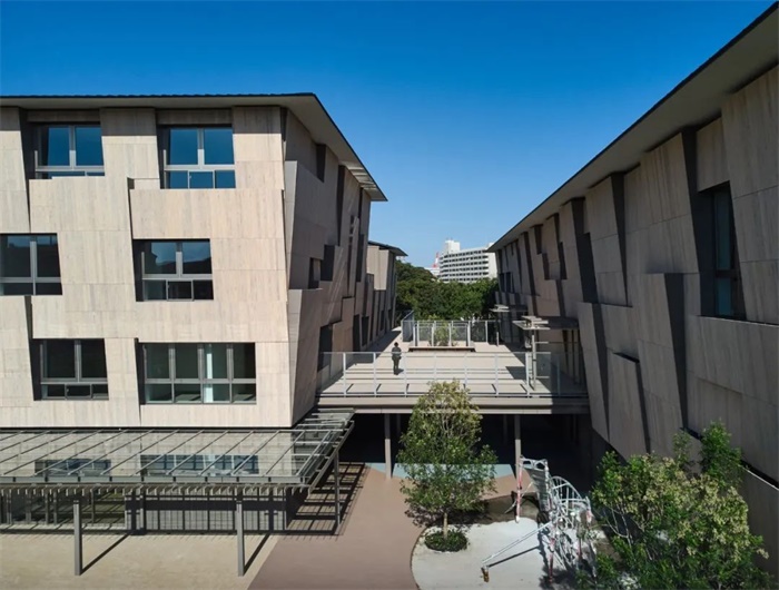 隈研吾建筑都市设计事务所的建筑师以项目立面的木制面板定义了这栋全新的横滨国际学校教学楼。一系列与花槽结合在一起的倾斜的表面,用于分割项目的巨大体