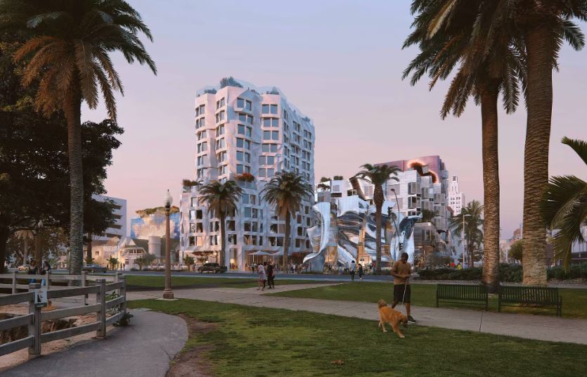 盖里建筑事务所透露了圣莫尼卡海洋大道项目的最新效果图。该项目将在洛杉矶滨海的西界中心营造多用途文化园区。方案在现有的2英亩地块内新建一座120间