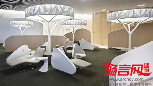 法国设计师Noé Duchaufour-Lawrance和品牌代理社Brandimage为巴黎戴高乐机场创作了一个类似公园的商务休息室,其中包含