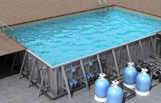 Degaulle整体泳池材质使用2mm厚的镀锌钢板,系统包括了钢结构围板系统、泳池平台及走道系统、泳池防水装饰胶膜系统、循环水处理系统、整体功能