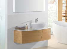 Aveo艾维欧新一代卫浴家具与卫浴陶瓷搭配和谐,更彰显浴室的现代与温馨。家具前部采用弧线,梳洗柜台面呈椭圆形,与洗面盆搭配完美和谐。纯橡木和深色