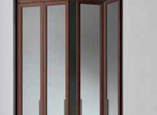 DORSIA木框玻璃折叠门配有咖啡色边框和Ambra Acidato玻璃,门把手表层为氧化铝材质。DORSIA创新设计体现在推拉门和双向铰链上。